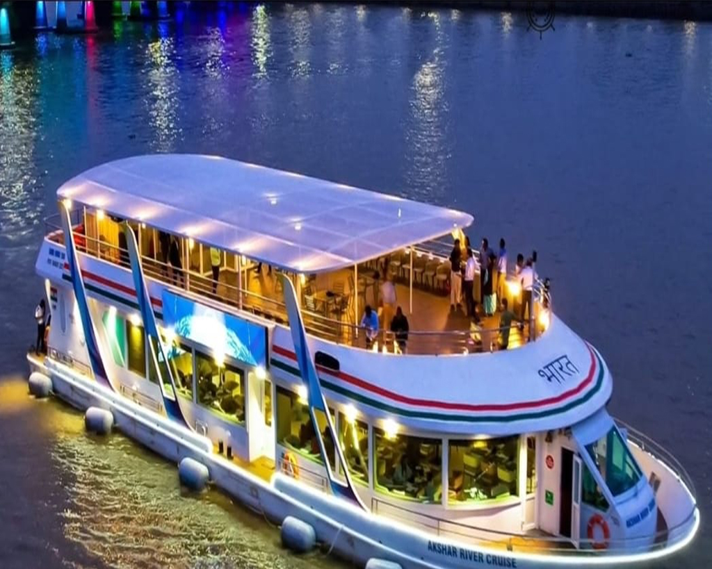 Comfortable Luxury Boat – Spacious seating, upper viewing deck, clean washrooms, safety-equipped.